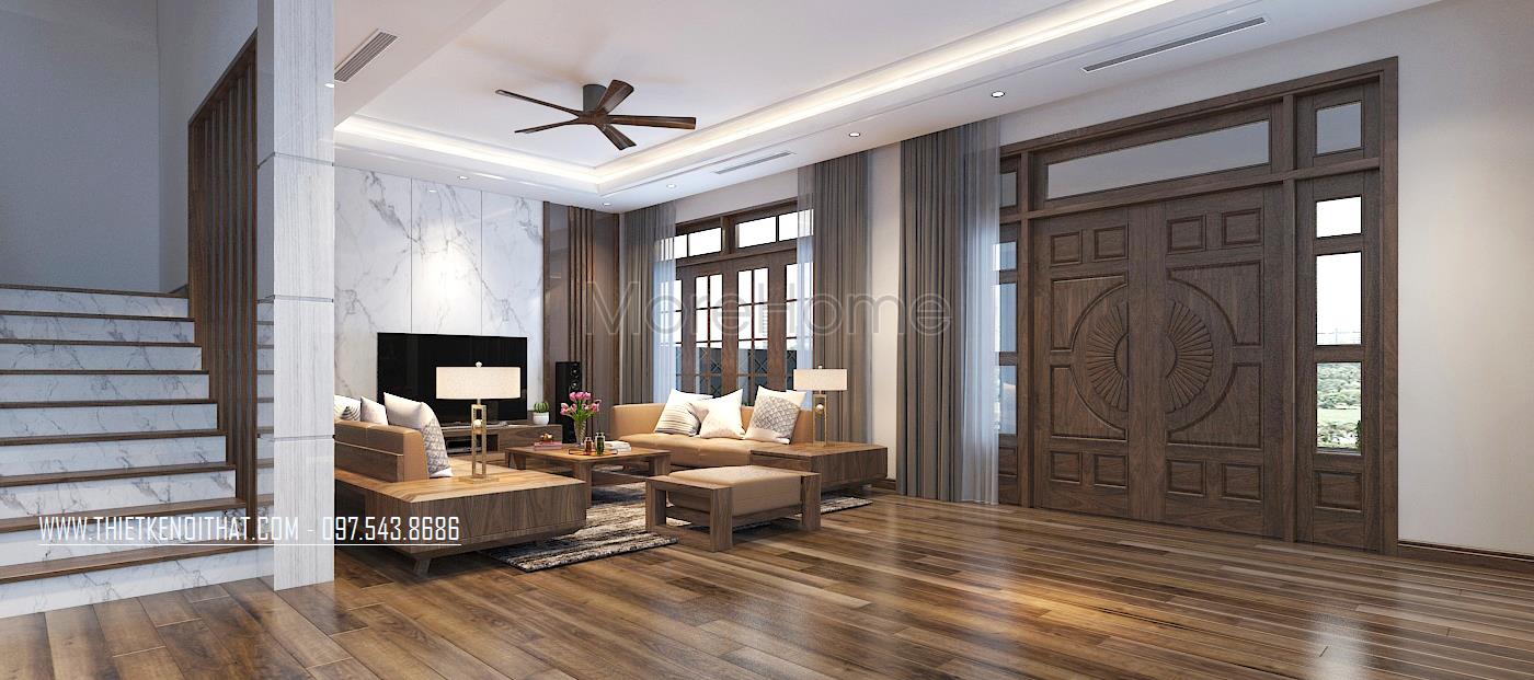 Đá ốp trắng vân mây kết hợp gỗ óc chó